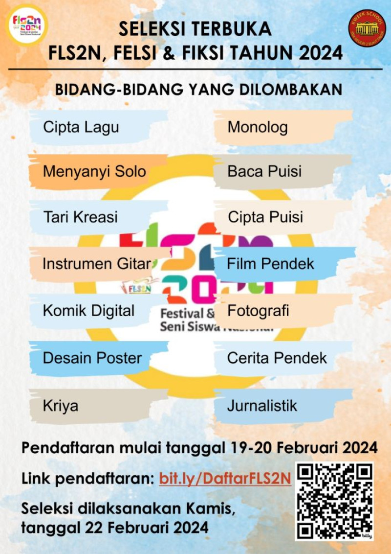 Seleksi Terbuka SMA Negeri 2 Bukittinggi untuk FLS2N (Festival dan Lomba Seni Siswa Nasional), FeLSI (Festival Literasi Siswa Indonesia) Dan FIKSI (Festival Inovasi dan Kewirausahaan Siswa Indonesia) Tahun 2024.
