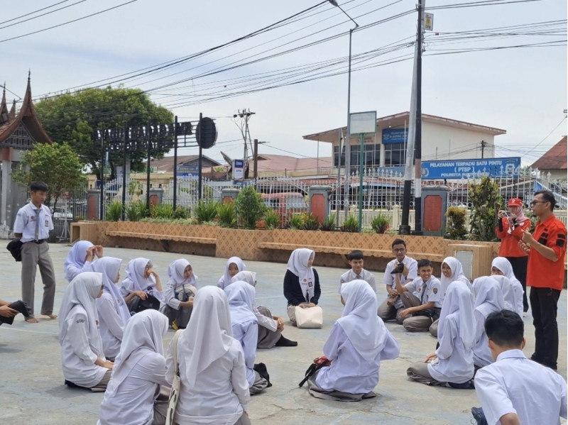 Perwakilan Guru dan Siswa SMA Negeri 2 Bukittinggi Bersama Tim dari Palang Merah Indonesia melakukan simulasi untuk mendapatkan pengetahuan dasar tentang apa yang akan dilakukan ketika bencana terjadi. Hari Kesiapsiagaan Bencana Nasional Tahun 2025 mengangkat tema "Siap untuk Selamat"
